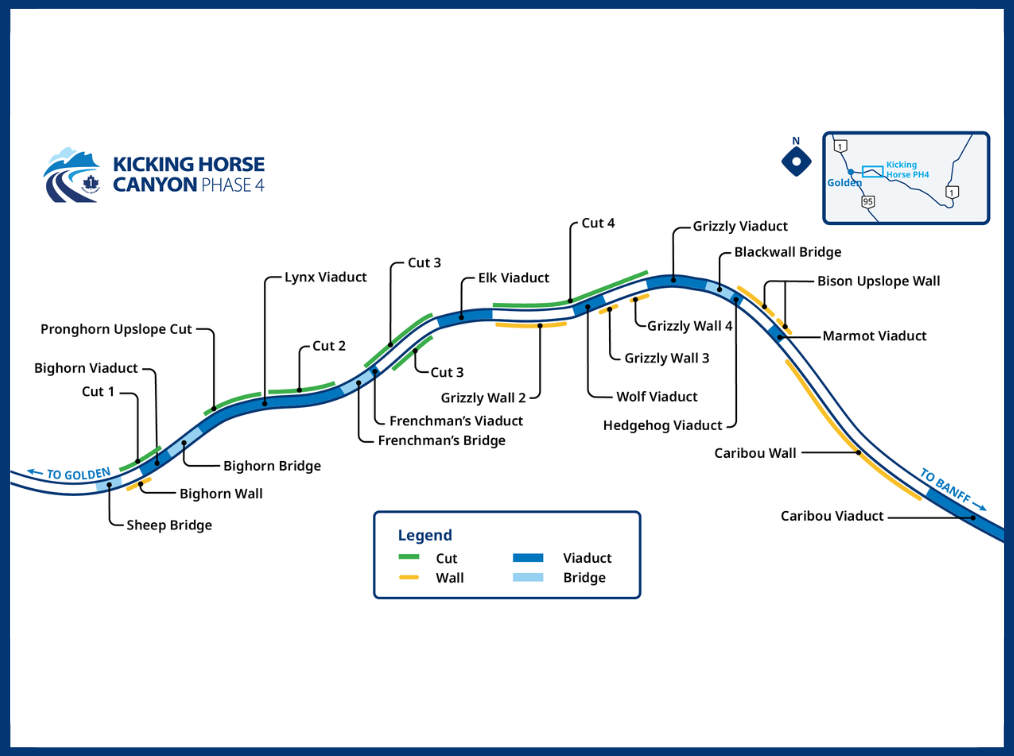 Phase 4 of the Kicking Horse Canyon Project lies between the previously-completed Phase 3 West (Golden Hill to West Portal) and Phase 1 (Yoho Bridge) sections. Completed in 2024, the project has: